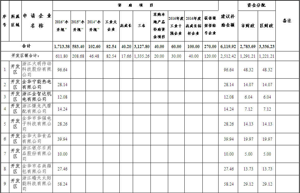 根據(jù)金華市人民政府《關(guān)于進一步降低企業(yè)成本減輕企業(yè)負擔(dān)的若干意見》(金政發(fā)〔2016〕25號)、《關(guān)于加快培育現(xiàn)代產(chǎn)業(yè)體系打造先進制造業(yè)基地的通知》(金政發(fā)〔2016〕40號)、《關(guān)于全面推進“三名”工程的實施意見》(金政發(fā)〔2014〕42號),金華市人民政府辦公室《關(guān)于培育發(fā)展市區(qū)工業(yè)大企業(yè)大集團的實施意見》(金政辦發(fā)〔2014〕7號)、《關(guān)于印發(fā)金華市區(qū)高成長企業(yè)培育辦法通知》(金政辦發(fā)〔2014〕6號)、《關(guān)于支持小微工業(yè)企業(yè)規(guī)范升級的若干意見》(金政辦發(fā)〔2013〕40號)、《關(guān)于促進小型微型企業(yè)再創(chuàng)新優(yōu)勢的通知》(金政辦發(fā)〔2012〕79號)等文件精神,市經(jīng)信部門及時下發(fā)通知,組織企業(yè)申報,經(jīng)過企業(yè)申報、各區(qū)初審和金華君安會計事務(wù)所審計,現(xiàn)將2016年度市區(qū)小升規(guī)企業(yè)、工業(yè)大企業(yè)大集團、高成長企業(yè)、“三名”培育試點企業(yè)、采購本地產(chǎn)品項目、工業(yè)十強企業(yè)、高成長標(biāo)桿企業(yè)、獲省級榮譽稱號企業(yè)等財政補助資金予以公示,公示期:2017年10月21日—10月27日,聯(lián)系人:鄭海員;聯(lián)系電話:82463730。