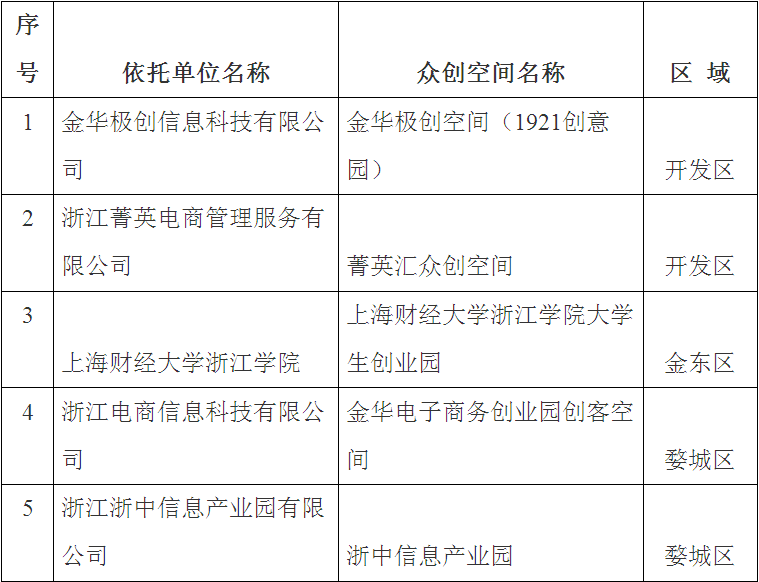 根據(jù)《金華市科學(xué)技術(shù)局關(guān)于印發(fā)金華市眾創(chuàng)空間管理辦法(試行)的通知》(金市科〔2016〕70號),擬認定金華極創(chuàng)空間(1921創(chuàng)意園)等7家單位為金華市級眾創(chuàng)空間,現(xiàn)予以公示,接受社會監(jiān)督。如有異議,請來人來電反映,以個人名義反映的,請署真實姓名;以單位反映的,須加蓋單位公章;匿名反映的材料不予受理。公示日期為12月19日至12月26日。