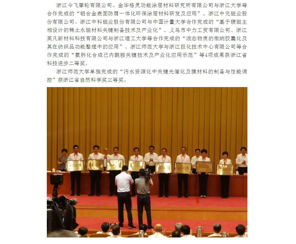 浙江萬里揚股份有限公司牽頭與北汽福田汽車股份有限公司、金華市計量質量科學研究院等合作完成的“商用車變速器輕量化、模塊化技術的研究及產(chǎn)品開發(fā)”、橫店集團東磁股份有限公司單獨完成的“無線充電用高磁導率FS500鐵氧體片”、浙江道明光電科技有限公司與道明光學股份有限公司完成的“符合ECE R104微棱鏡型反光膜關鍵技術研發(fā)及產(chǎn)業(yè)化”、金華市中醫(yī)醫(yī)院單獨完成的“脾腎陽虛血瘀型腎衰的理論基礎及腎毒寧方干預機制研究”、金華市公路與運輸管理中心牽頭與東南大學等合作完成的“浙江省重載干線公路車轍機理與路基路面一體化防治技術”、浙江綠巨人生物技術有限公司與浙江大學等合作完成的“適宜糖尿病食用高抗性淀粉水稻種質創(chuàng)制、機理特性及產(chǎn)業(yè)開發(fā)”、義烏市中醫(yī)醫(yī)院與浙江省立同德醫(yī)院合作完成的“丹溪學派的傳承發(fā)展與著述研究”、金華市農(nóng)業(yè)科學研究院、金華市荊龍生物科技有限公司、浙江壽仙谷醫(yī)藥股份有限公司與浙江農(nóng)林大學等合作完成的“金線蓮優(yōu)異種質創(chuàng)新及生態(tài)栽培關鍵技術研究與應用”、國網(wǎng)浙江省電力有限公司金華供電公司與杭州電力設備制造有限公司等合作完成的“新型開關設備態(tài)勢感知與智能運維關鍵技術及產(chǎn)業(yè)化”、東陽市人民醫(yī)院與杭州電子科技大學等合作完成的“面向健康養(yǎng)老的人機共融智能監(jiān)陪護系統(tǒng)關鍵技術及應用”、浙江凱文磁業(yè)有限公司與中國計量大學等合作完成的“新能源汽車用高耐熱沖擊釹鐵硼關鍵制備技術及其電機應用”、浙江師范大學與杭州醫(yī)學院等合作完成的“基于浙江實踐的農(nóng)村衛(wèi)生發(fā)展策略研究”等12項成果獲浙江省科技進步獎三等獎。